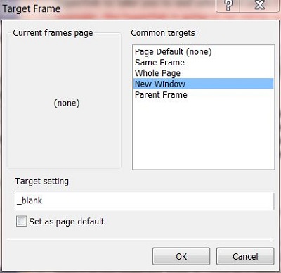 Select if you want the page to open in a different window, entire window or the window you are currently using (for this example, we are having the hyperlink open in a new window so we will still have the main page open)